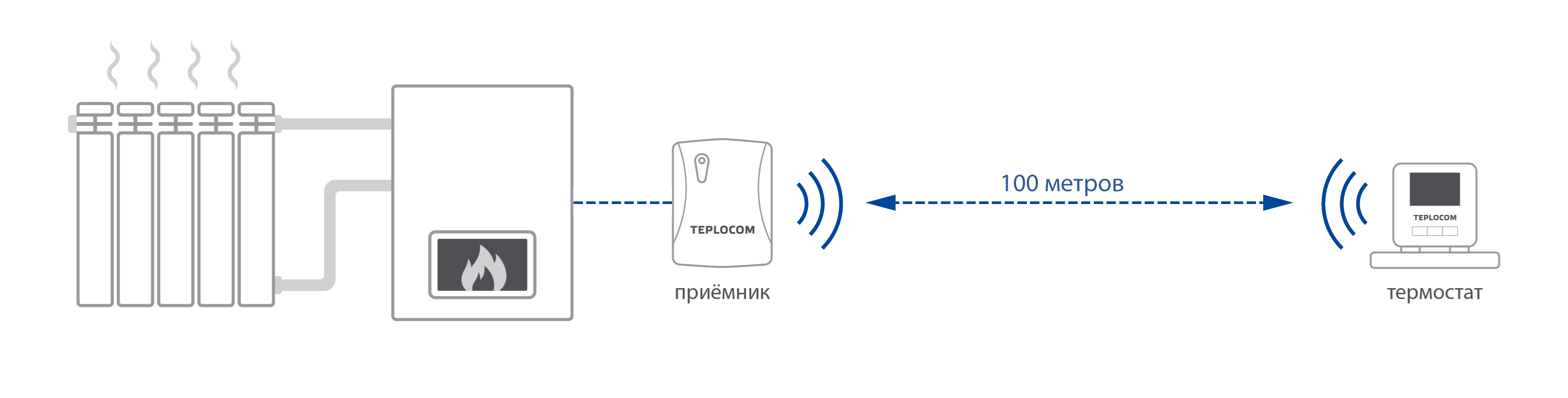 В беспроводном комнатном термостате TEPLOCOM применяется двусторонняя связь термостата и приёмника. В отличие от аналогов термостат не только передаёт сигнал приёмнику, но и ждёт отчёта о получении, и в случае потери пакета данных повторяет отправку, что значительно увеличивает надёжность системы.